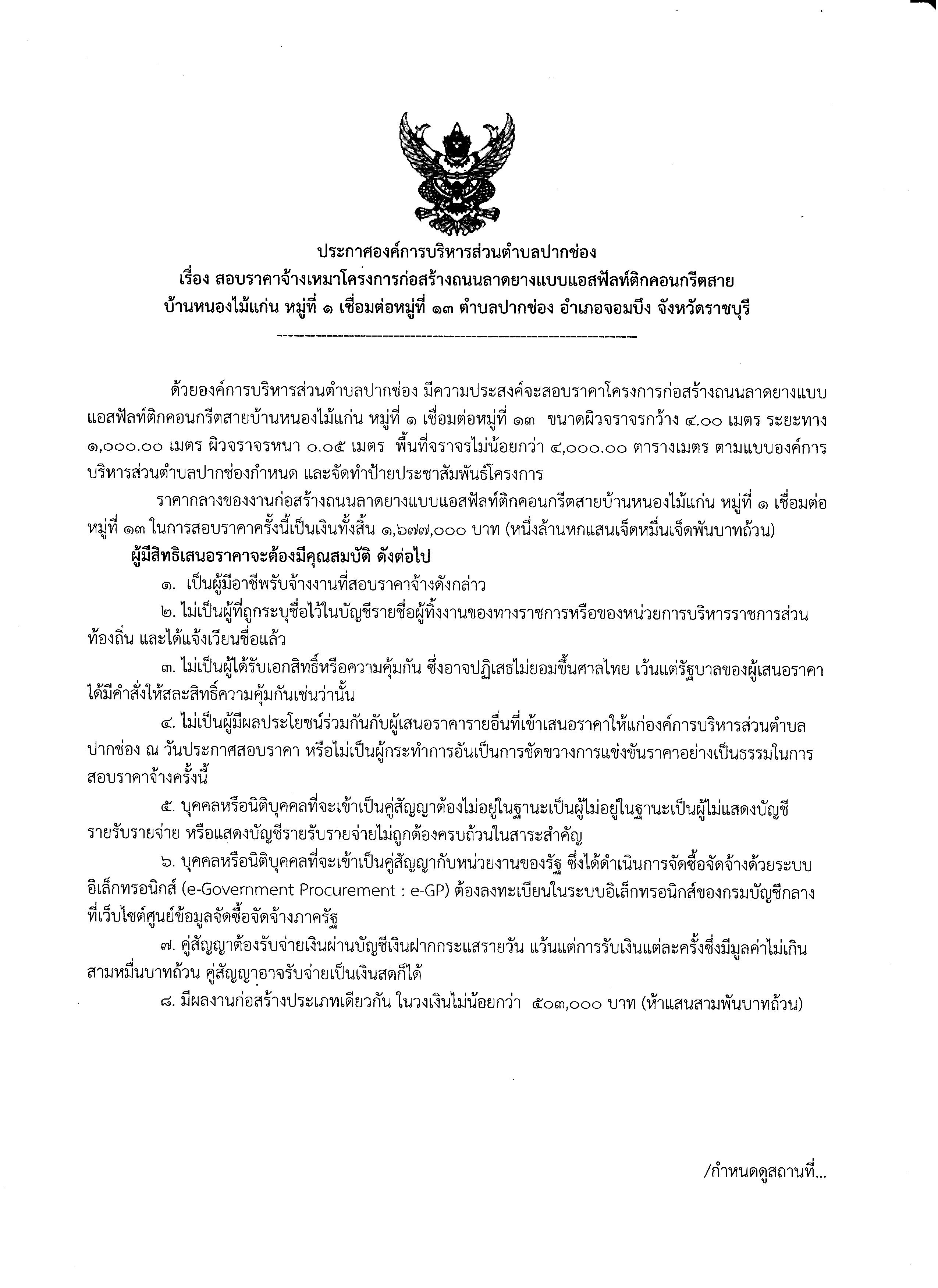 ประกาศสอบราคาจ้างเหมาโครงการถนนลาดยางแบบแอสฟัลท์คอนกรีตสายบ้านหนองไม้แก่น หมู่ที่ 1 เชื่อมต่อหมู่ที่ 13