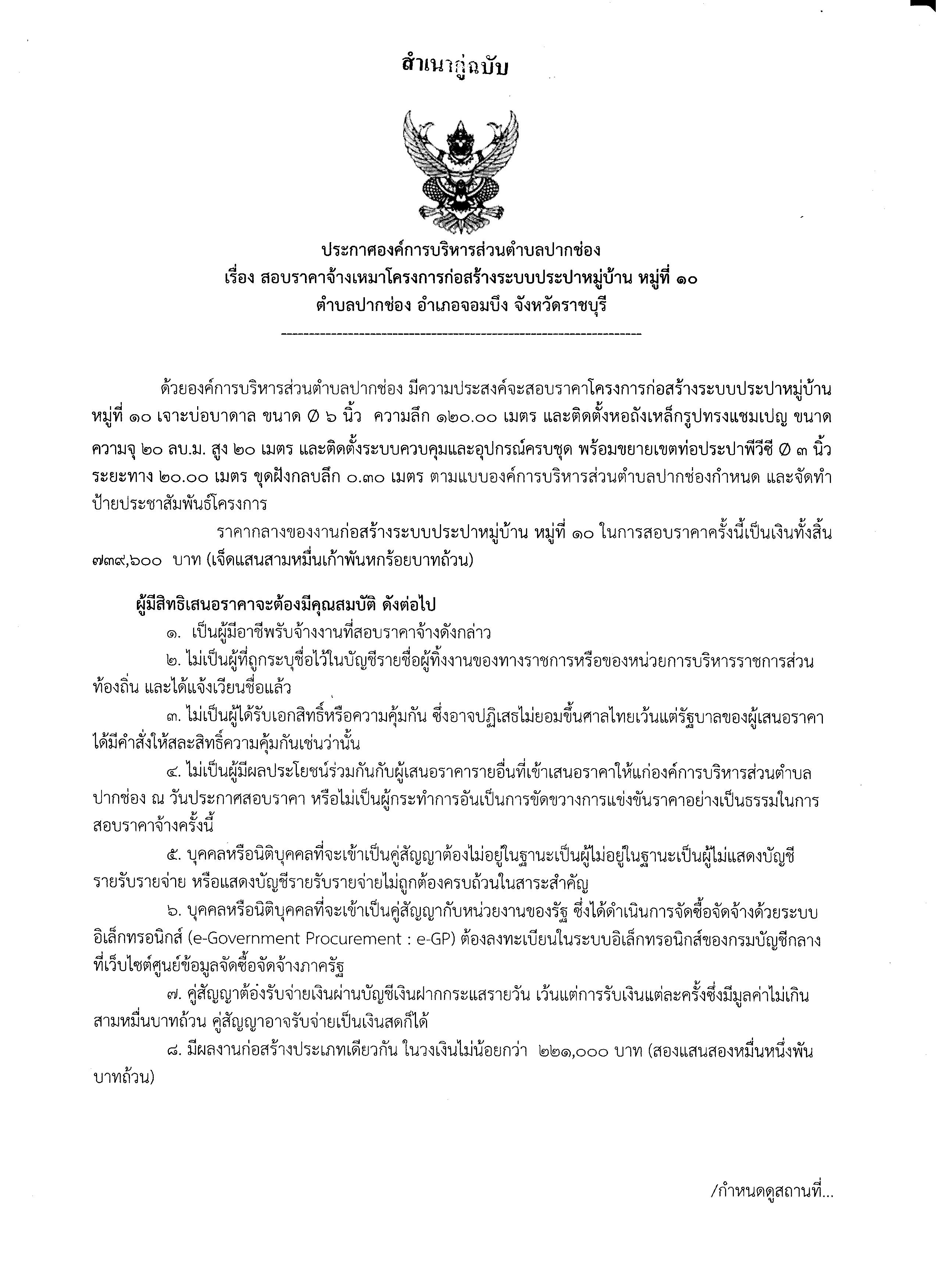 ประกาศสอบราคาโครงการก่อสร้างระบบประปาหมู่บ้าน หมู่ที่ 10